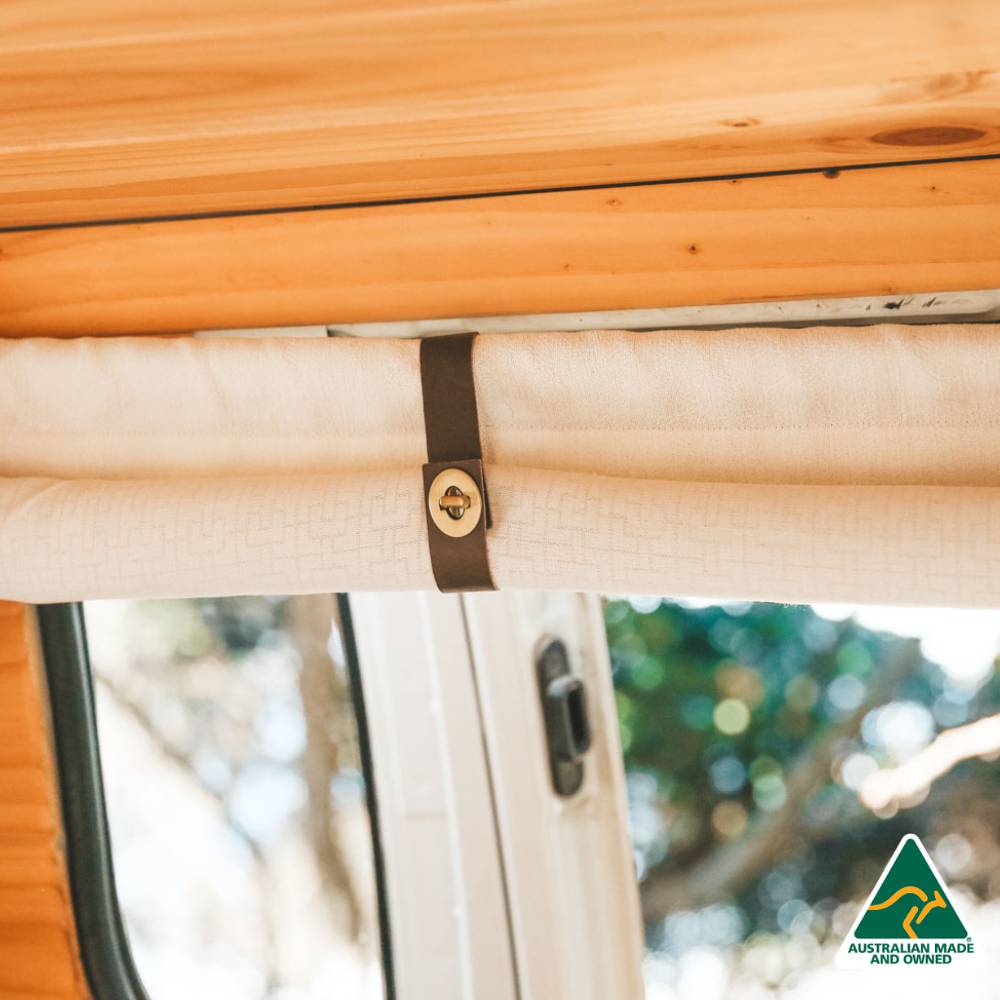 Our curtains are available for the rear windows, side windows and also behind the driver’s seat and front cabin for blocking all light from the windscreen. Once you wake in the morning, the rear and side curtains can be rolled up and easily secured with the included leather strap, while the curtain behind the cabin can be opened to the side.Â